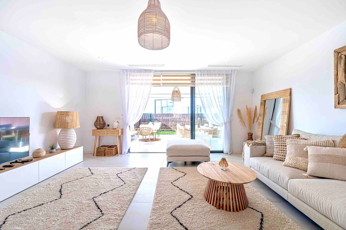 Berehat dan bersantai di ruang yang tenang dan bergaya ini, 10 minit berjalan kaki ke pantai dan kelab padel di depan pintu. Baru dibina pada tahun 2022 dan dilengkapi dengan perabot yang menakjubkan untuk mewujudkan persekitaran santai pantai. 3 bilik tidur double di tingkat atas dan bilik ke-4 di tingkat bawah untuk 2 orang lagi, dengan bilik mandi. Tingkat bawah adalah ruang tamu yang terang dan lapang dengan ruang luar yang menakjubkan yang boleh digunakan sebagai ruang santai dan ruang makan dalam atau luar yang boleh dibuka sepenuhnya atau ditutup dengan tingkap kaca.