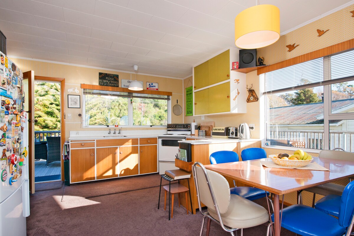 Terselindung di dalam belukar di atas Pantai Kaiteriteri yang indah dengan pemandangan menakjubkan dari garis pantai Abel Tasman merentasi Marlborough Sounds, rumah percutian baharu 3 bilik tidur dengan dek yang luas ini adalah tempat percutian musim panas yang sempurna. Selesa untuk tidur 4 orang dewasa dan kanak-kanak. 2 minit memandu atau 15 minit berjalan kaki menyusuri trek yang tenang ke Pantai, Restoran dan Kedai Kaiteriteri. 15 min memandu ke bandar Motueka. 15 minit memandu ke Mārahau, pintu masuk ke Taman Negara Abel Tasman.