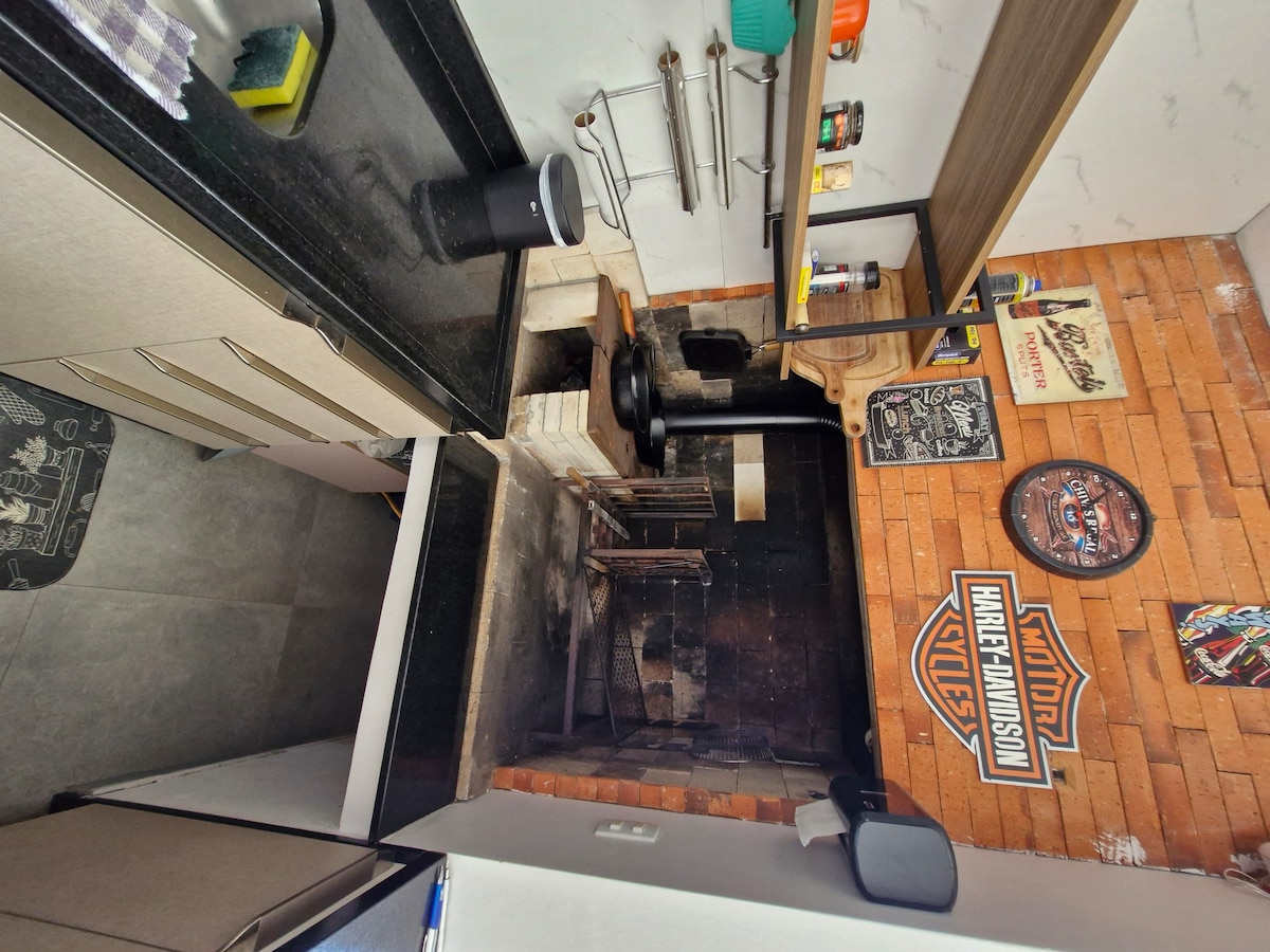 Casa foi construída com minhas próprias mãos ao longo de 9 anos e ainda não terminei, com um estilo de liberdade que sempre busquei, como todos que frequentam falam a casa nos abraça com uma energia. A casa tem um pé direto de 6 metros, com estilo de um loft. Construção feita em alvenaria e com muita madeira, tendo um estilo de uma cabana Americana. O ambiente e seus detalhes são todos pensados para o conforto e aconchego de quem permanece na casa como a lareira, o jogo de luzes e o som.