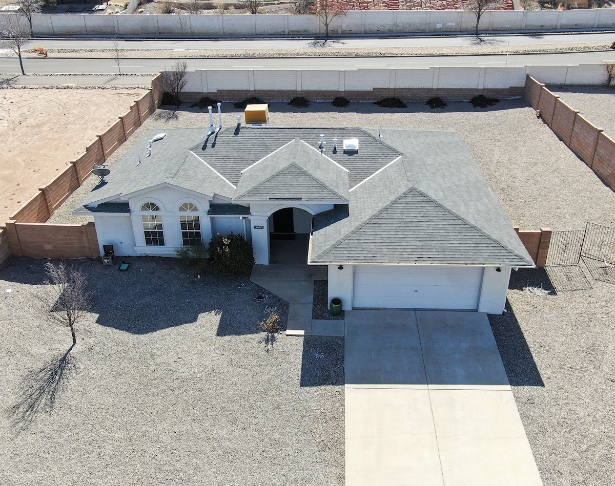 Hos akan menemui anda untuk memberikan anda kod pintu dan lawatan ke penginapan ini. Seluruh rumah dengan halaman belakang seperti taman. 3 bilik tidur, 2 bilik mandi, dapur, ruang tamu, ruang makan, bilik matahari, & mesin basuh/pengering. Penginapan ini berhampiran dengan Rio Rancho, Pusat Perubatan Presbyterian, Pusat Perubatan Serantau Sandoval, Intel, HP, dan Pusat Acara Rio Rancho. Haiwan peliharaan dialu-alukan dengan bayaran ($ 50 bagi setiap haiwan peliharaan) * Haiwan peliharaan mesti bersama pemilik semasa berada di luar *Haiwan peliharaan tidak dibenarkan pada perabot atau katil * Sisa haiwan peliharaan mesti diambil