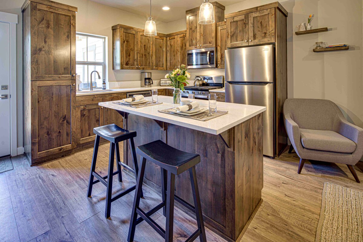 Lokasi membolehkan berjalan kaki mudah ke Downtown dan Old Mill District. Satu blok ke Deschutes River. Sewaan berperabot lengkap satu bilik tidur moden. Dapur serba lengkap, mesin basuh/pengering di unit. Pemanas/pendingin hawa tanpa saluran untuk keselesaan anda. Smart TV menyediakan penstriman dan TV kabel HD peringkat teratas. Kawasan simpanan berkunci 5' x 9' persendirian untuk kayak, basikal, kelab, ski, papan. ... dilarang merokok dan maaf, tiada haiwan peliharaan. Lesen Operasi Jangka Pendek Majlis Perbandaran Bend No. STR-15-0016 .