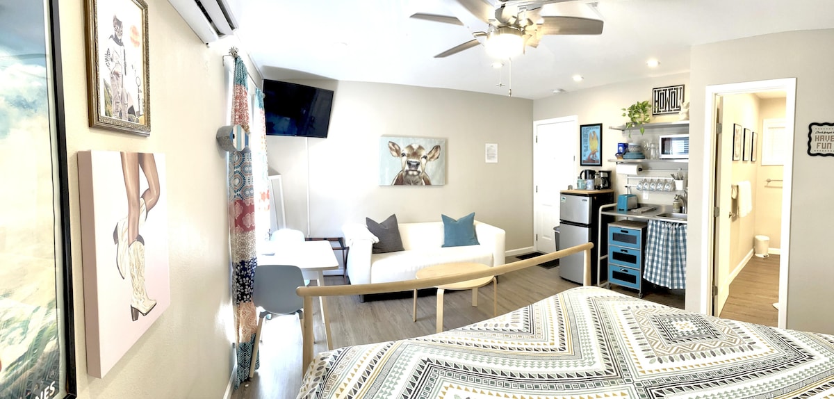 Lokasi: Terletak di bawah pokok-pokok Live Oak yang indah, berjalan 10 minit (0.5 batu) ke pintu masuk ke Lady Bird Lake Boardwalk, berjalan kaki 12 minit (1.7 batu) ke bahagian terbaik South Congress, berjalan kaki 29 minit (1.5 batu) ke pusat bandar. Tidur: Nikmati cadar Pemulihan linen Perkakasan di atas katil Queen size kami yang selesa. Untuk parti yang terdiri daripada tiga orang, tilam udara yang mengembang sendiri disediakan. Dapur: Kopi dan beberapa bir tempatan menanti anda di dapur penuh. Jika anda rasa ingin menginap untuk memasak, kami ada pilihan periuk dan kuali untuk memasak di atas dapur/ketuhar. Apa-apa lagi yang anda perlukan, kami dengan senang hati akan menyediakannya kerana kami tinggal di rumah depan di penginapan ini. Ruang: Oasis menghadap lorong di belakang penginapan kami, membolehkan anda datang dan pergi pada waktu lapang anda. Kami gembira untuk anda menikmati halaman belakang, asalkan anda tidak keberatan untuk berkongsi ruang dengan kami dan/atau Poodle Obi standard kami. Jika anda tidak suka anjing, kami dengan senang hati akan membenarkan dia keluar di halaman depan, maklumkan saja kepada kami. Selain itu, kami terutamanya melepak di halaman depan, jadi kemungkinan besar anda tidak perlu berkongsi halaman. :) Kami akan berinteraksi dengan anda sebanyak atau sesedikit yang anda mahu. Kami berdua telah tinggal di sini agak lama sekarang jadi ingin memberi cadangan jika anda berminat! :) Studio ini terletak di tengah-tengah Travis Heights, kejiranan yang paling menawan, bersejarah, dan terletak di bandar ini. Alami Austin tulen dengan menggulung oak besar ke bar, restoran dan kedai yang berbaris di South Congress.