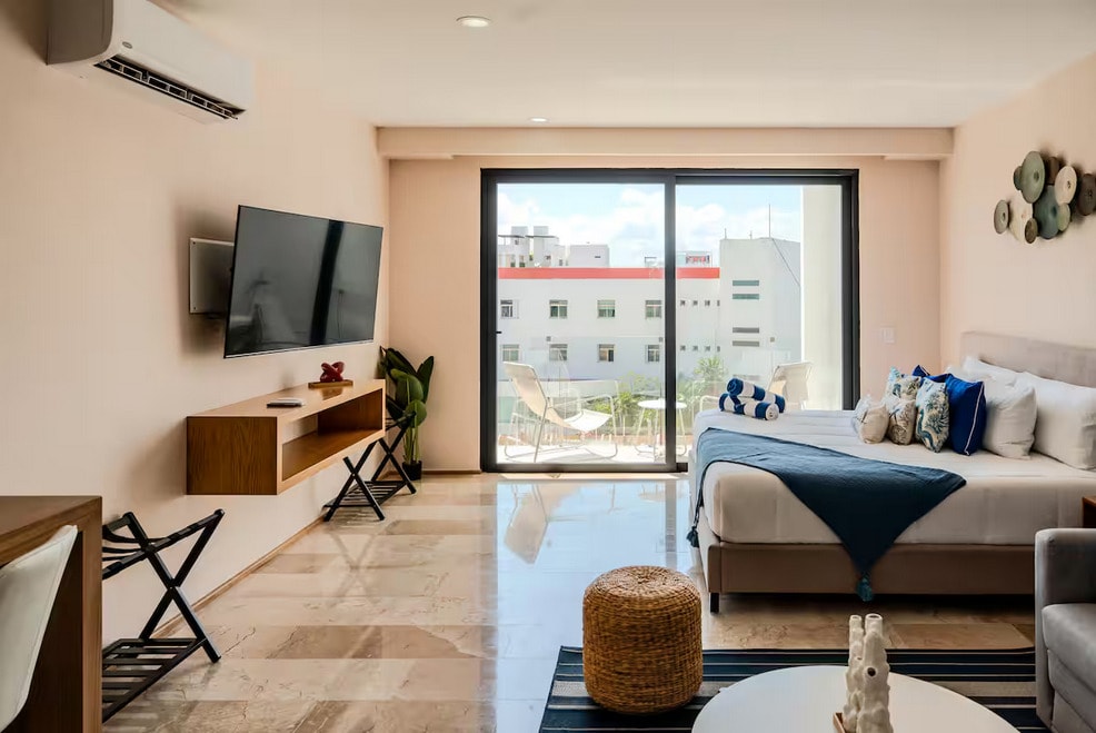 Modern, adults-only apartment in a quiet neighborhood just minutes from downtown. Guests love the peaceful setting and return often for the rooftop plunge pool, BBQ area, and daily housekeeping. Cruise the coast on free bikes or explore nearby shops and cafes. ✔ Rooftop Pool ✔ Starlink WiFi ✔ Free Bikes ✔ Full Kitchen ✔ Night Security ➕ 7-Eleven only one block away Bonus: 10% off scuba diving with top-rated Scuba Life Cozumel. Ages 12+ only.