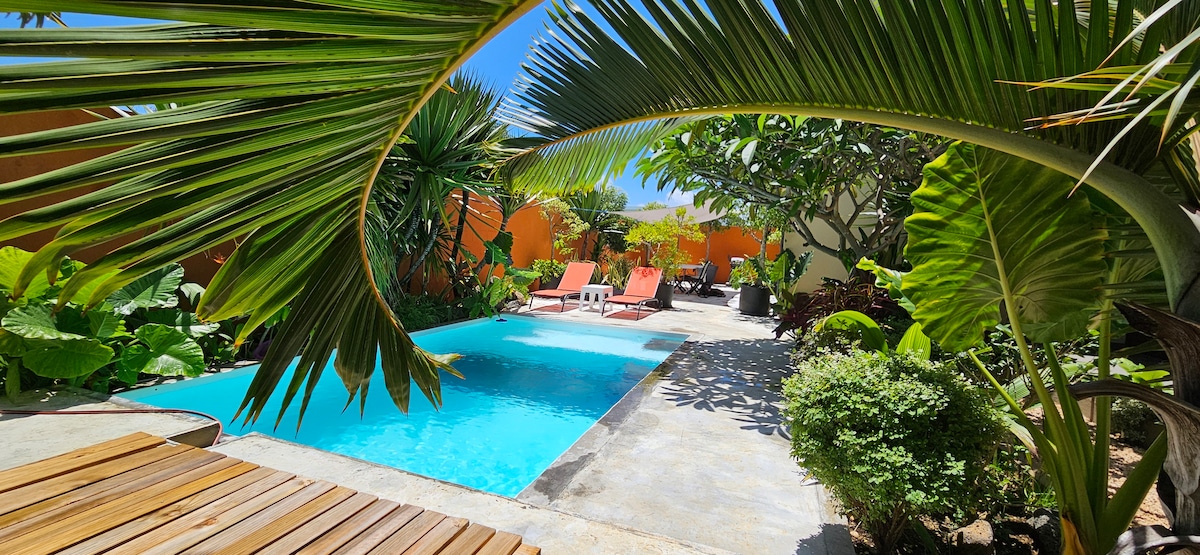 Studio annexed to a typical Creole style house and located in a quiet and secure residential area with a private access and a parking. Accommodation on the ground floor, doubled bed is on a mezzanine above the living room. Adjoining bathroom and small living room including a single bed, a kitchenette and a dining and/or office area. Access to an outdoor kitchen, tropical backyard and swimming pool. Located 1km from Pereybere beach, shops, ATM and restaurants. Bus stop nearby.