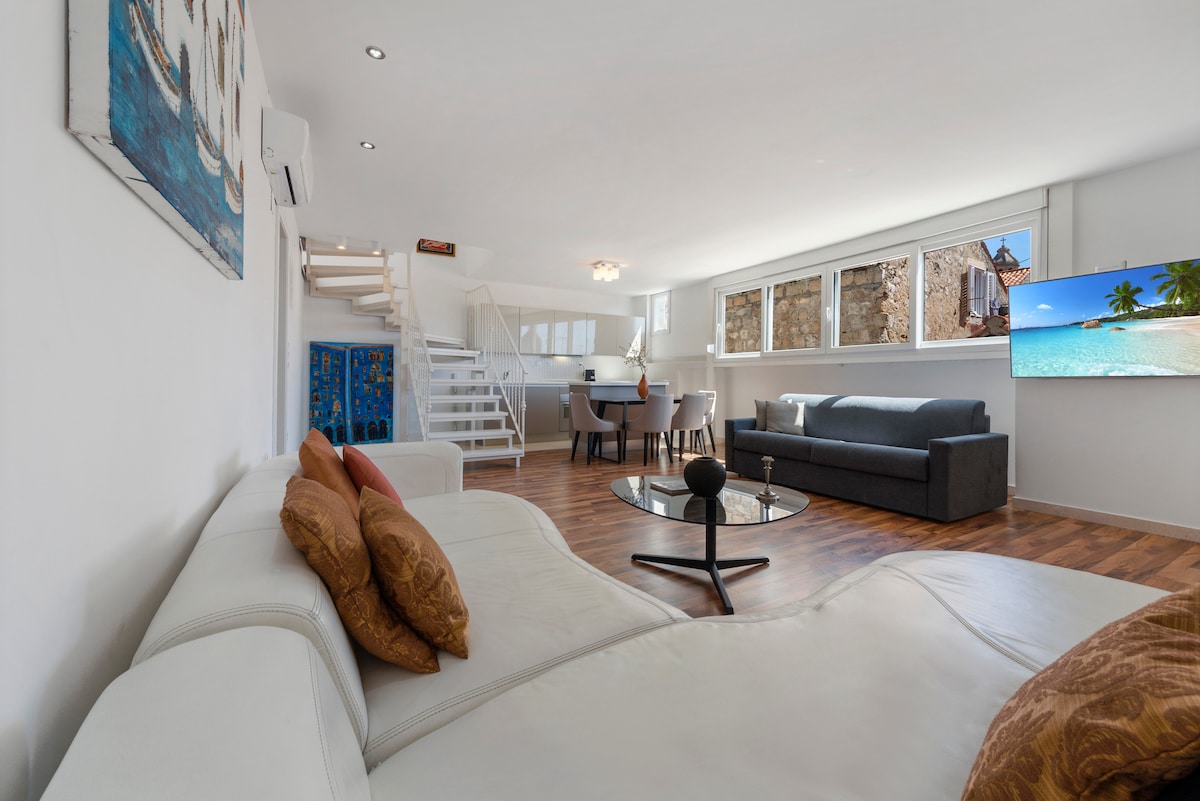 Loteng yang selesa dan moden di lokasi yang sempurna, hanya beberapa langkah dari dinding bandar dan pintu gerbang Ploče, dengan pemandangan bandar Lama, laut dan pulau Lokrum yang paling menakjubkan. Ia terdiri daripada 2 bilik tidur double, bilik mandi, tandas, dapur yang serba lengkap, pejabat dan ruang makan dan ruang tamu dengan teres yang menghadap bumbung ajaib dan pelabuhan lama Dubrovnik. Terletak betul-betul di atas bandar Lama di kawasan Ploče, semua tarikan utama dan pantai dalam jarak berjalan kaki.