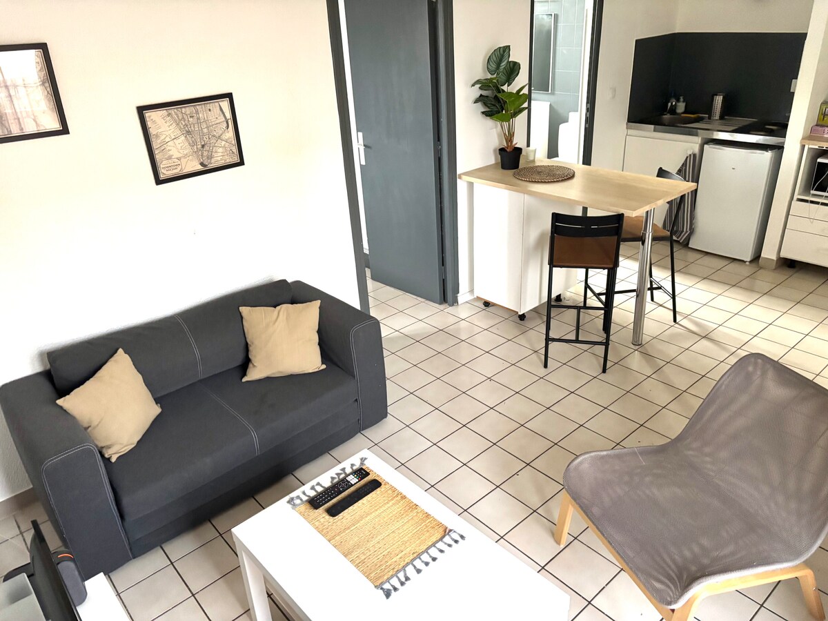 Apartmen T2 berhawa dingin yang cantik, bilik tidur/bilik mandi/ruang tamu/dapur kecil/balkoni yang cantik, terletak di pusat bandar dinding rendah 20 minit dari Toulouse. Ia berhampiran dengan semua kemudahan (kedai, ruang letak kereta awam percuma, laluan bas, stesen kereta api 2 minit jauhnya). Ia dilengkapi dengan sofa yang boleh ditukar kepada dua tempat tidur, katil kelamin, WIFI gentian optik, TV, pembuat kopi, peti sejuk, ketuhar gelombang mikro, dapur memasak, mesin basuh. Hubungi saya untuk soalan lanjut