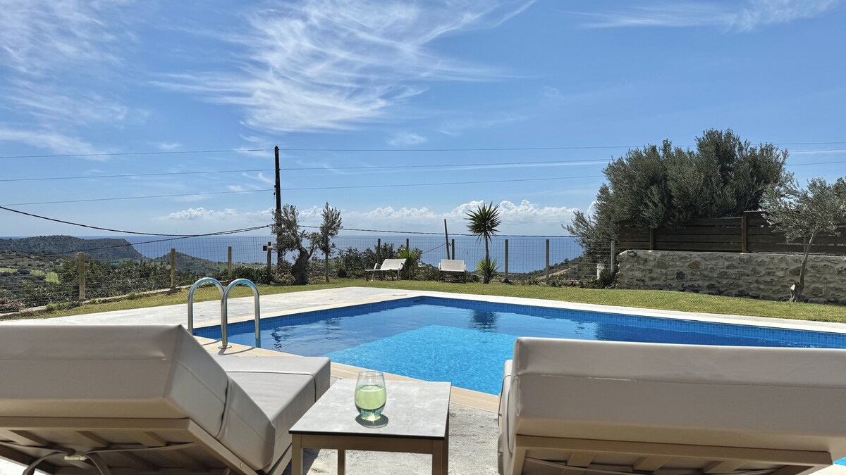 Celestia Cove is approved by the Greek Tourism Organization & managed by "etouri vacation rental management". Perched on a hilltop with sweeping views of the sparkling Cretan Sea, Celestia Cove is the ultimate holiday escape. Built with natural stone that blends seamlessly into the earth, the villa feels like an organic extension of its surroundings. From sunrise to sunset, immerse yourself in uninterrupted panoramas of the endless blue.
