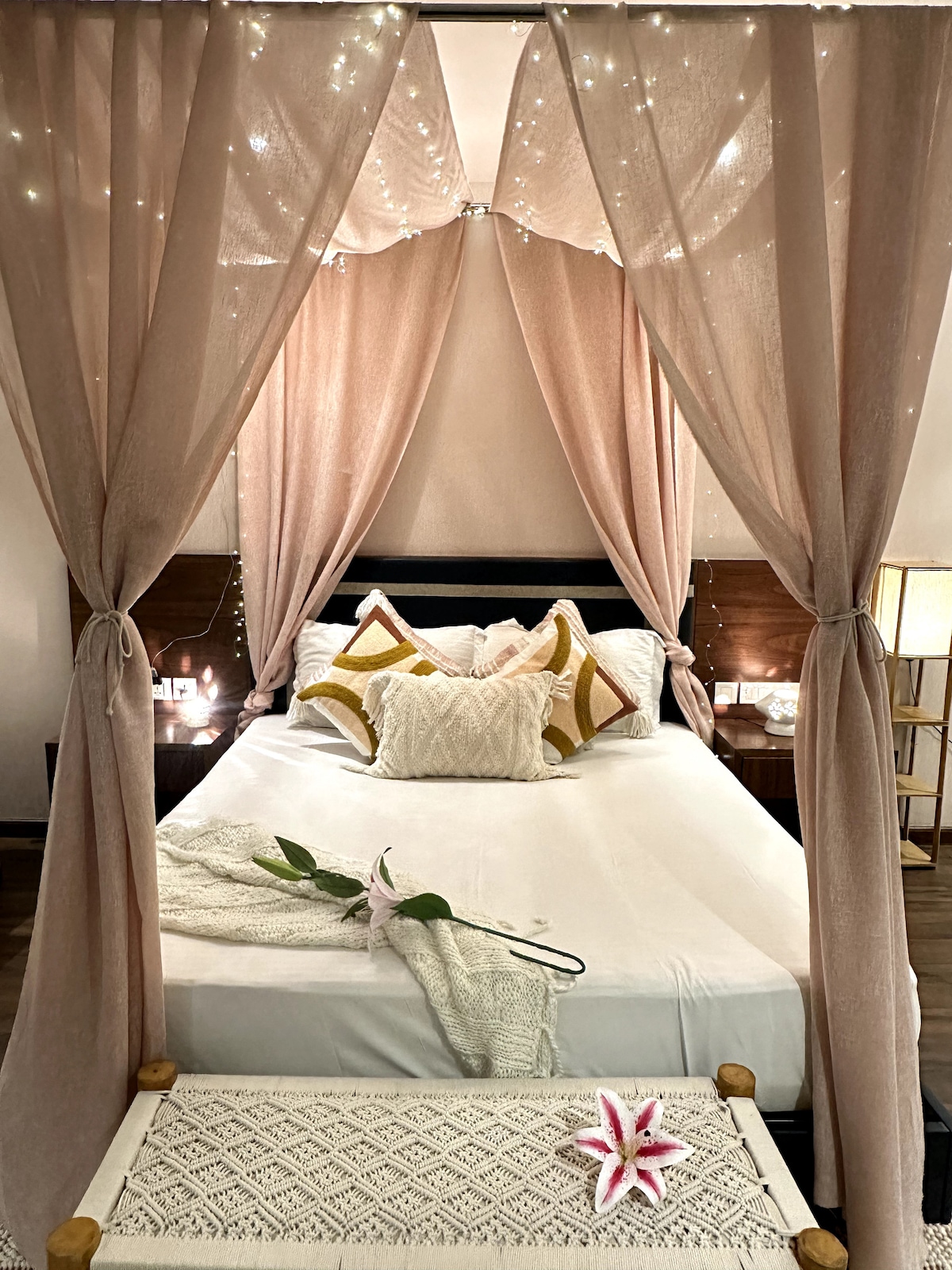 Glittering Drapes: Kandy Romance, a luxurious escape in the vibrant Satya Element One. This enchanting apartment is where romance meets style, wrapped in a playful palette of pinks and whites that dance across the room like the lights of a city at night. A timeless gem, perfect for those seeking a retreat with a touch of whimsy. The bed, crowned with soft, shimmering drapes, invites you to sink into its plush embrace, surrounded by carefully chosen decor that whispers of elegance and charm.