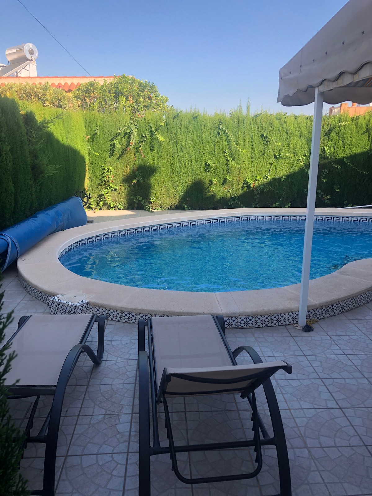 The perfect private retreat, close to amenities, beaches, restaurants, bars, golf, traditional local towns and a water park. Super-King bedroom with en-suite, a king and a twin with 2 single beds. Bathroom with walk in shower, Open Living & Dining leading to kitchen. 3 terraced areas for relaxing. A sheltered patio near the pool with loungers for midday shade. AC throughout. Private, gradient pool is perfect for kids of all ages (can be heated £200 charge). Three outdoor dining/eating areas.