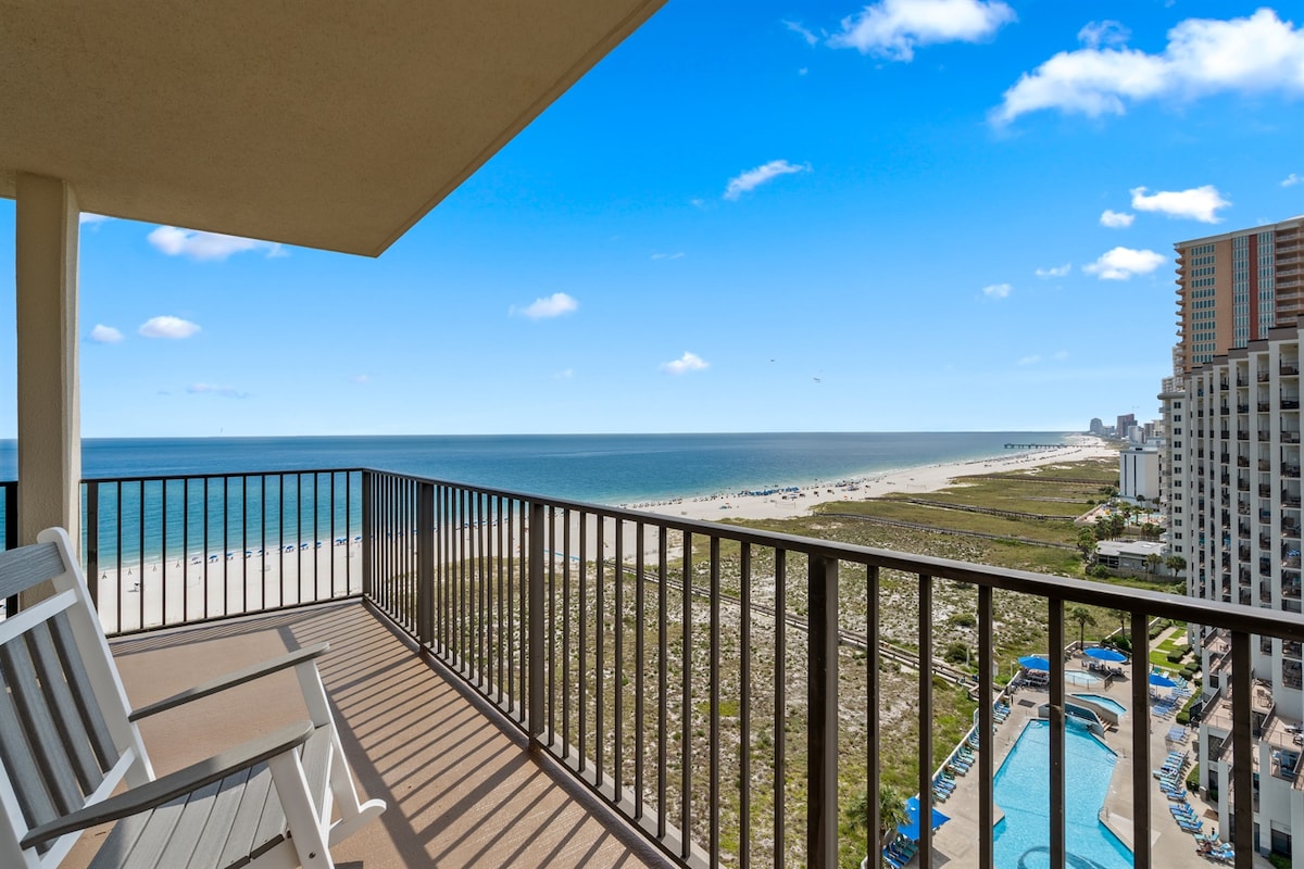 Kolam renang dalaman dan luaran!! Gulf Front! - Katil 1700 kaki persegi untuk 10 tetamu. Di tingkat 14 dengan pemandangan Teluk Mexico yang hijau zamrud, balkoni, 2 bilik tidur dengan katil king dan bilik mandi ensuite, 2 sofa tidur queen dan 2 katil twin rollaway. Dapur ini serba lengkap. Tempat duduk meja/bar untuk makan. Mesin basuh/pengering di unit. Gimnasium, tab mandi air panas, pad percikan kanak-kanak. Lubang api. Kami menawarkan set permulaan untuk produk kertas, dan detergen. WiFi disediakan.