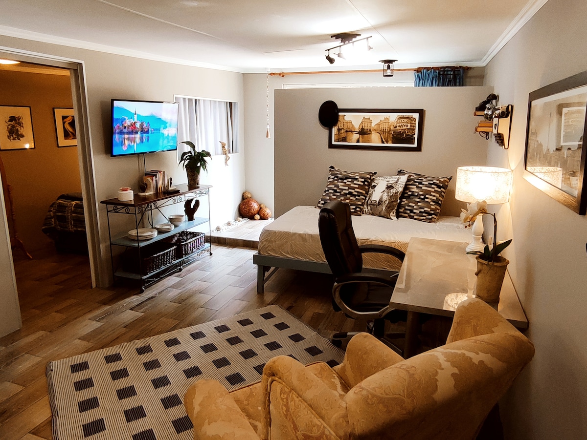 -Situated in Little Falls/West Rand. -Private entrance to Studio Suite. -INVERTER BACKUP & WATER BACKUP. -Free WiFi, TV with Netflix, Disney+, YouTube/Music, +more -On suite shower, basin and toilet. -1x double bed and 1x sleeper couch. -Kitchenette for food prep & wash-up. -Fridge, microwave, kettle, toaster, iron, heater (in Winter and cold spells), fan & hairdryer Cutlery & Crockery. -11+ popular fast food restaurants & Clearwater Mall within a 2km radius. Safe FREE parking on premises.