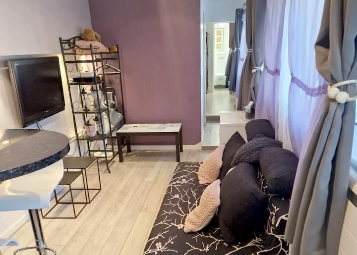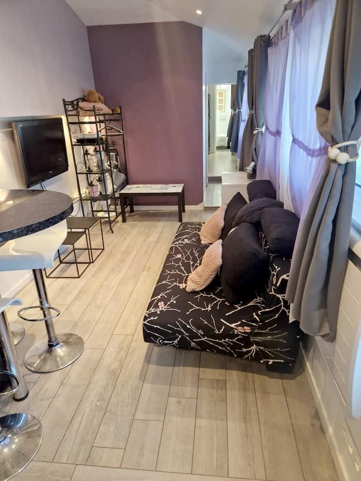 Bilik-bilik kecil tetapi disusun dengan baik untuk mengoptimumkan ruang: dapur, ruang tamu, bilik tidur, bilik mandi, tandas di bilik tidur, mesin basuh-pengering, meja kecil. ⚠️ Tandas hanya boleh diakses dari bilik tidur, yang boleh menyusahkan di luar tetapan keluarga.