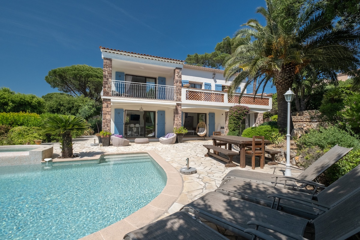 Vila dengan pemandangan indah, kolam renang dalam yang besar dan jakuzi. Akses pantas ke pantai. Tempat yang tenang, taman yang luas dengan banyak pokok. 5 bilik tidur dengan katil double besar termasuk 2 "Suite", 4 bilik mandi dan 4 tandas. Pendingin hawa/pemanas mengikut bilik tidur dan ruang tamu. 2 tempat letak kereta yang selamat, dengan stesen pengecasan elektrik (pilihan) (*) Termasuk pemanasan Jacuzzi (6 tempat duduk) pada bulan April, Mei, pertengahan Jun dan pertengahan September (**) bot ulang-alik ke Saint Tropez, berdekatan.