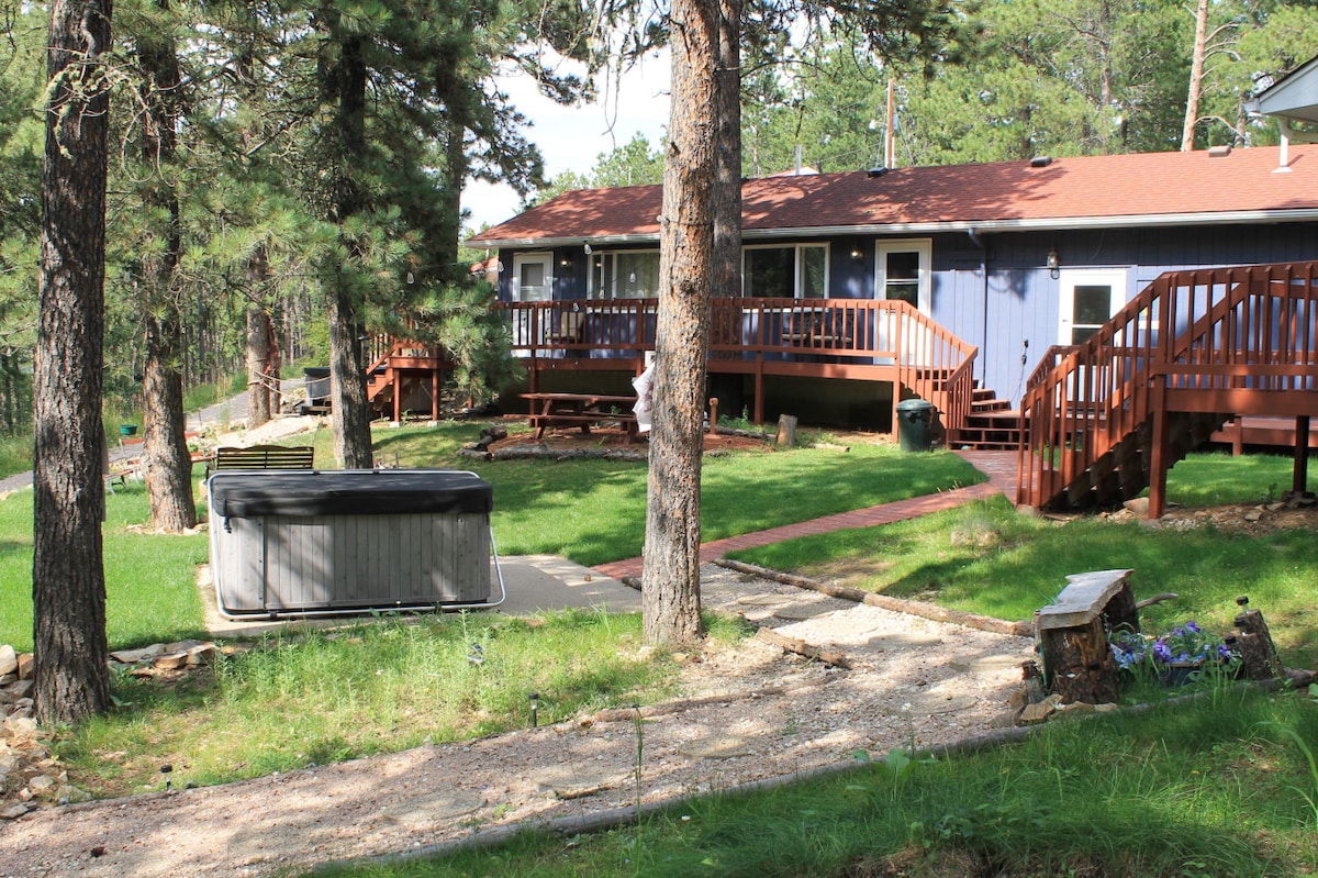 Kami boleh memuatkan sehingga lapan orang di kabin 1356 kaki persegi yang luas dan lengkap ini. Terdapat tiga bilik tidur dan 2 bilik mandi. Ketenangan total di Black Hills utara di atas satu ekar hutan. Laluan Snow mobile dan ATV terletak kira-kira 1 batu jauhnya, 4.5 batu dari Mickelson Trail. Untuk malam yang menyeronokkan di bandar, Deadwood terletak 8 batu jauhnya. Mount Rushmore, Keystone, Reptile Gardens semuanya dalam jarak 45 minit memandu.
