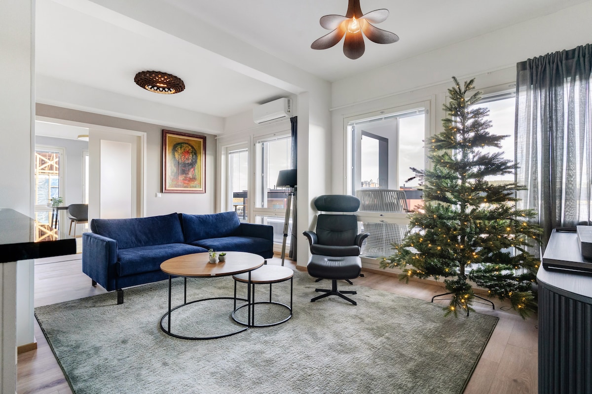 Winter Dream Suite – Luxury and Relaxation Near the City Center This high-quality and spotless apartment accommodates up to four guests and features a private sauna and a cozy balcony. The location is perfect: a peaceful setting ensures restful nights, yet the city center with its services and attractions is just a short walk away. Scandinavian style 2nd floor apartment has a large living room, alcove with queen size bed, sauna and furnished balcony. Fully equipped kitchen.