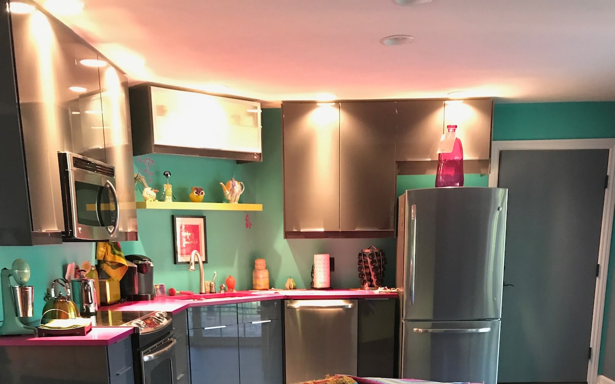 Ini adalah ruang 1,000 kaki persegi yang menyeronokkan yang sangat moden dan baru. Ia hanya digunakan untuk tetamu, jadi saya memutuskan untuk meletakkannya di Airbnb. Ini ialah kediaman persendirian dan saya tahu anda akan menikmati penginapan anda. Terima kasih kerana mencari! Jika perlu, terdapat lif kerusi. Ruang ini mempunyai satu katil queen dan juga katil sofa.