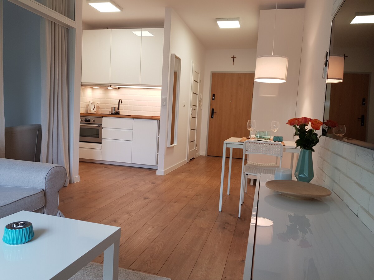 Apartmen yang terletak di tingkat 3 dengan lif di blok empat tingkat di estet perumahan baru yang tenang dan hijau. Berhampiran, terdapat terminal bas (6 minit berjalan kaki), banyak kedai runcit (Lidl, Żabka, Stokrotka) dan pusat perniagaan (Shell, Motorola, Nokia, Jagiellońskie Centrum Innowacji). Istana Wawel(Istana Diraja) -8.5km Lapangan Terbang Balice – 15 km Apartment ini mempunyai ruang letak kereta persendirian (di garaj bawah tanah). Netflix tersedia. Anda boleh menyewa basikal (RM50 semalam)