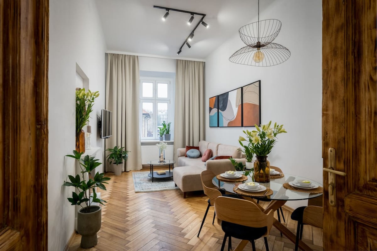 Apartmen yang luas dan elegan di Old Town - sesuai untuk 6 orang yang mencari keselesaan dan suasana unik di pusat bandar Krakow. Terletak di rumah susun bersejarah, ia menggabungkan pesona bersejarah dengan perabot moden: ruang dalaman yang cerah dan bergaya, susun atur bilik yang teliti dan pendiangan elektrik yang selesa yang mewujudkan suasana yang hangat dan santai pada waktu petang. Apartmen ini juga menawarkan balkoni persendirian yang menghadap halaman hijau - tempat yang sesuai untuk minum kopi pagi atau berehat.
