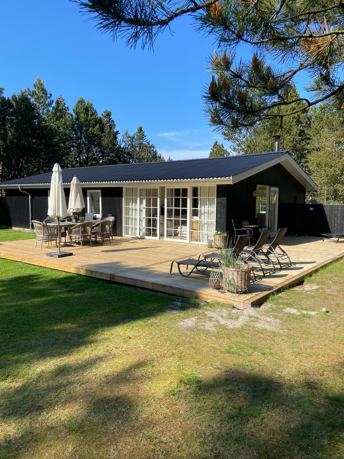 Kotej ini terletak di Pantai Barat dalam jarak berjalan kaki ke pantai, ladang bukit pasir dan bandar pantai Tversted yang selesa. Rumah - yang terlindung sepanjang tahun terletak di atas tanah luas seluas 3000 m2 yang tidak terganggu dengan pemandangan kawasan semula jadi yang dilindungi. Kotej ini berpagar - dengan kawasan yang luas, dan oleh itu anda boleh membiarkan anjing anda berlari bebas. CATATAN: Dari Mei hingga Ogos, khemah dibuka dan oleh itu terdapat kemungkinan untuk 8 orang.