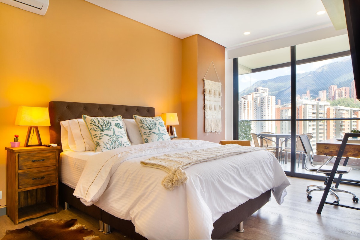 Luxury 70m² loft on the 9th floor of the iconic Energy Living. Open our floor-to-ceiling windows to transform your entire living space into an airy, open-air retreat with Medellin’s best skyline views. Features a King-size bed, two 80" TVs, and a sleek modern design. Enjoy a rooftop infinity pool, gym, and jacuzzi on the 22nd floor. Located 5 mins from Provenza and El Tesoro. Secure, quiet, and perfectly connected.