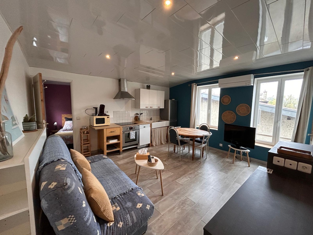 Selamat datang ke Loteng Beauvallon, luas dan cerah, di tengah-tengah alam semula jadi di Monts du Lyonnais, hanya 25 minit dari Lyon dan Saint-Etienne. Terletak di kediaman kami, anda mempunyai akses bebas dengan ruang letak kereta dan teres persendirian yang tidak diabaikan. Ia telah difikirkan sepenuhnya untuk anda menikmati percutian romantik yang sebenar. Sama ada menyaksikan matahari terbenam atau bintang-bintang di SPA, nikmati masa yang unik untuk berehat.