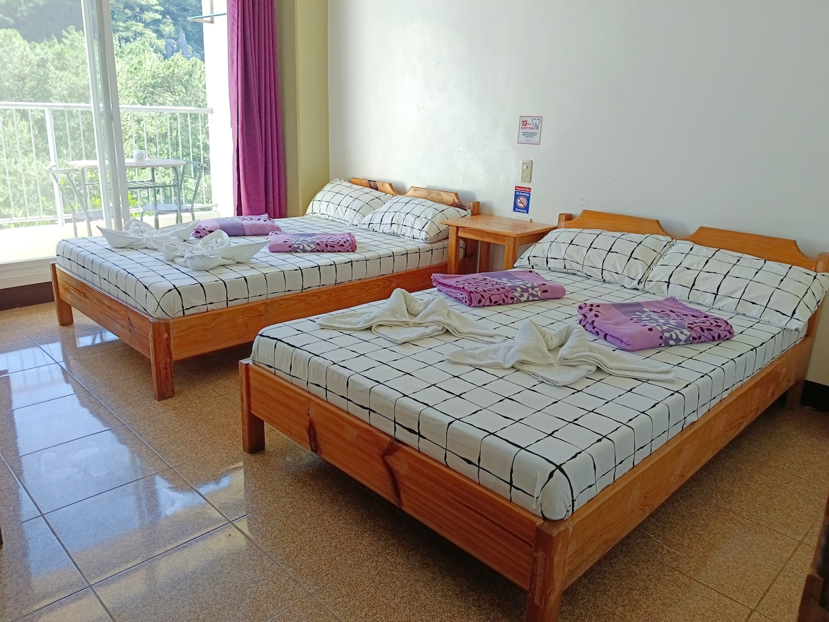 Amlangan Lodge room 3 is a private cozy room with 2 "double size" beds. It is located one floor level down the building entrance/lobby/dining with stairs to take. It has private toilet (with bidet) , sink, & bathroom (with hot shower) separate from each other, enabling guests to use these simultaneously and keeping the toilet floor clean, dry, and more comfortable. It has a balcony with a stunning view of pine forest & rock formations, which can also be viewed from your bed.