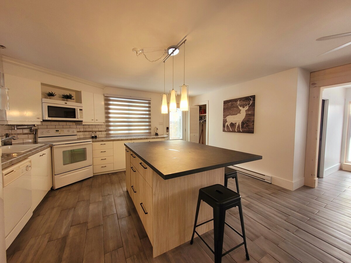 CITQ # 303514 Selamat datang ke syurga! Di kampung alpine stesen ski: Mont-Édouard Tingkat bawah adalah pelan terbuka, dikelilingi oleh 7 pintu patio, bilik mandi penuh (pancuran kaca), bilik dobi dan ruang depan. Lantai batu tulis dipanaskan. Pendiang api kayu di ruang tamu dan skrin TV 60 inci. Mesin basuh & pengering, WiFi untuk kerja jauh, pendiangan luar, kayu termasuk semasa ketibaan, BBQ (hanya pada musim panas). Privasi terjamin.