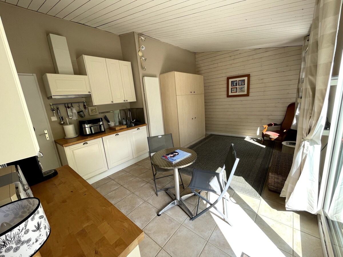 Studio bebas di rumah watak di tengah-tengah kampung dengan kedai-kedai berhampiran (5 minit berjalan kaki). Kemungkinan tidur orang ketiga kerana katil tambahan. Pantai-pantai ini terletak 25 minit jauhnya . Anda akan menikmati semua keselesaan. Ia termasuk bilik mandi, dapur kecil (ketuhar gelombang mikro, pembuat kopi, peti sejuk), TV. Anda akan menikmati halaman tertutup bebas kecil dengan perabot taman.