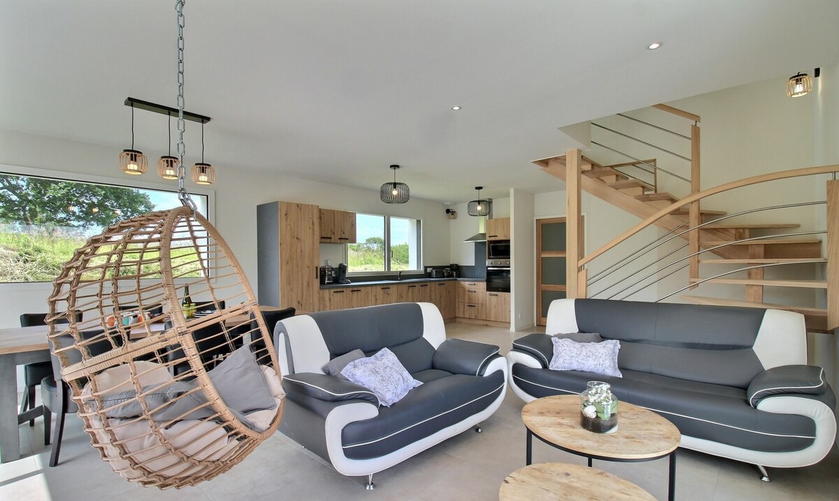 Terletak di kawasan luar bandar Breton, kotej yang menawan ini boleh menempatkan keluarga dan rakan-rakan untuk masa yang santai dan akses terus ke pantai (terletak 300 meter jauhnya, akses adalah laluan yang dikelilingi oleh kehijauan dan tidak boleh diakses oleh semua). Penginapan ini termasuk 2 bilik mandi serta 3 bilik tidur yang dilengkapi dengan katil double. Di tingkat atas anda boleh menikmati teres dengan pemandangan laut dan ruang tamu yang menyenangkan.