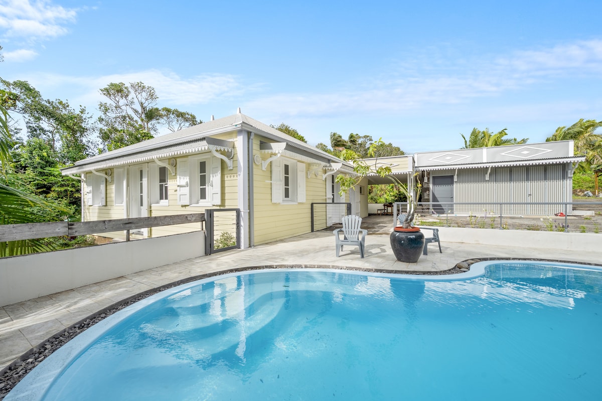 Chalet Creole yang menawan, kolam renang yang dipanaskan, taman