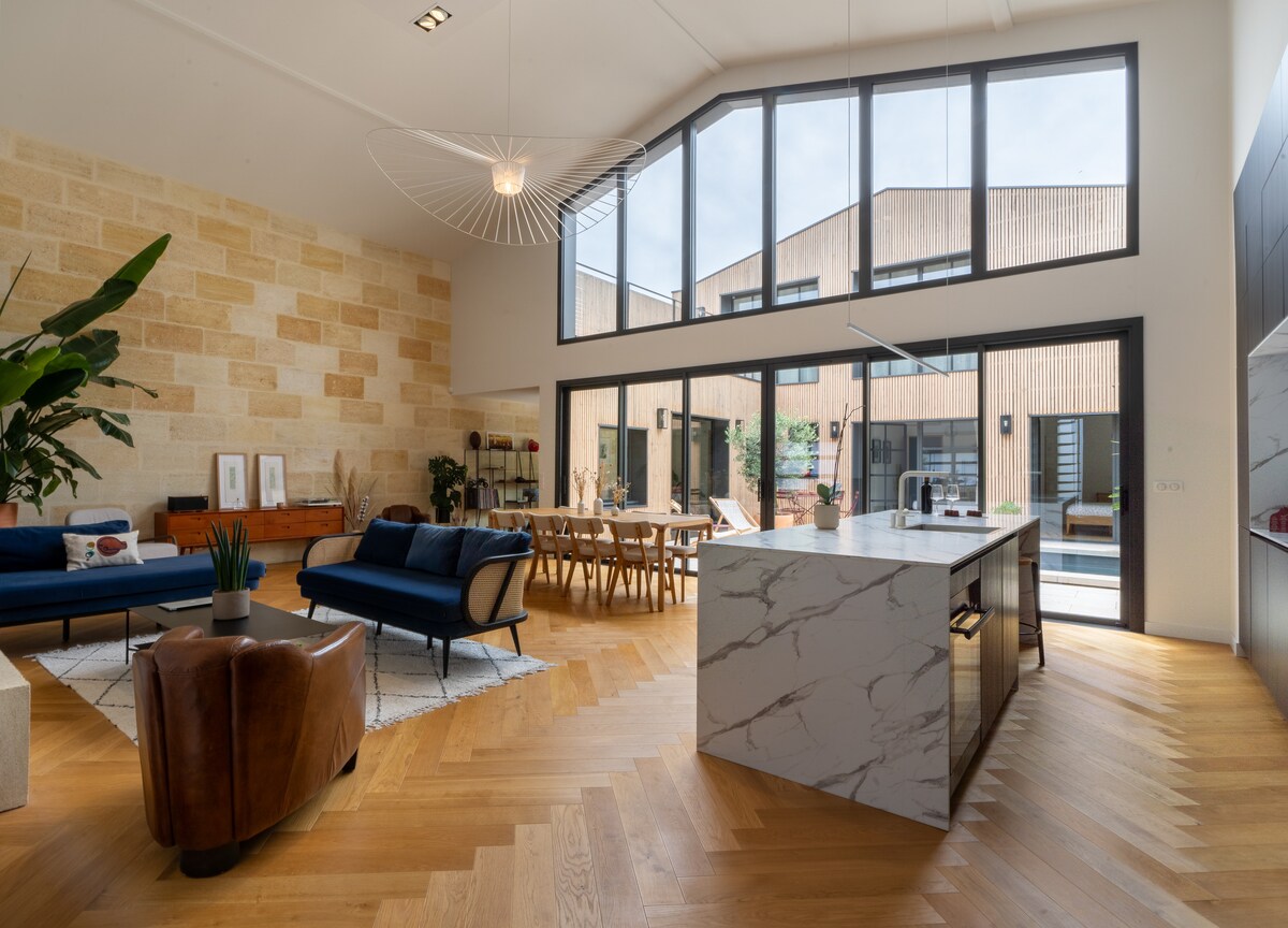 Nikmati percutian romantik di bangsal baharu seluas 75 m² ini, yang diubah suai sepenuhnya dengan penuh kemewahan. Direka untuk ketenangan dan privasi, ia mempunyai dua bilik tidur yang elegan dan boleh memuatkan sehingga 4 orang. Nikmati tab mandi air panas 2 tempat duduk peribadi, yang boleh diakses sepanjang tahun, untuk momen abadi untuk berdua. Akses dan tempat letak kenderaan persendirian. 100 m daripada pusat bandar dan 20 minit daripada Bordeaux. Haiwan peliharaan tidak dibenarkan. Pilihan atas permintaan: champagne dan sarapan pada hujung minggu.