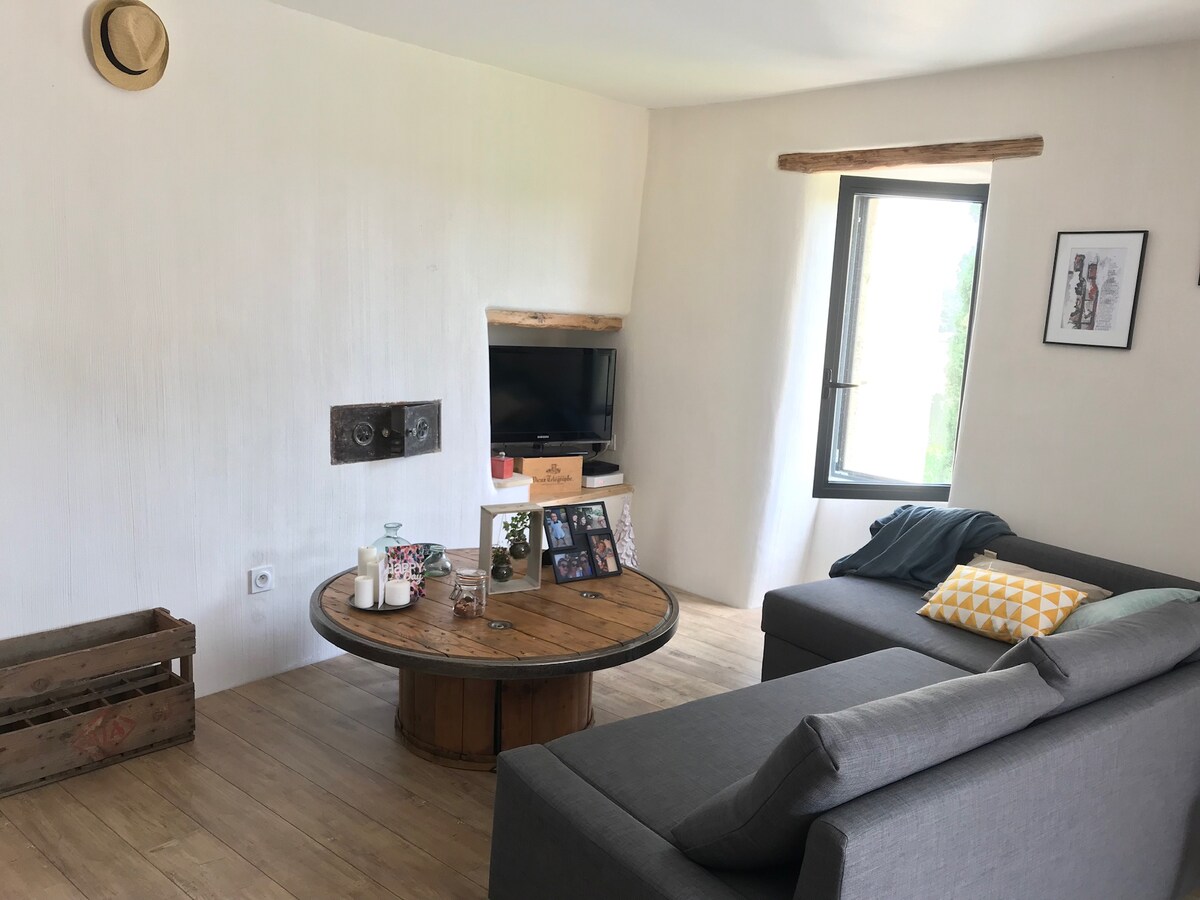Di Drome provençale, di sebelah Grignan, antara pokok anggur dan lavender, kotej kami adalah satu-satunya di penginapan ini. Ia berada di tingkat atas, untuk empat orang dewasa, bersebelahan dengan mas pemilik. Ruang tamu 48 m2, dengan dapur terbuka yang lengkap, kawasan bersantai dengan TV 127 cm, penyaman udara. Suite utama 35m2 dengan pancuran mandi Itali, sinki berganda, tandas bebas, penghawa dingin. Mezzanine seluas 30 m2. Kedua-dua katil adalah 160 X 200. Teres persendirian dengan barbeku weber