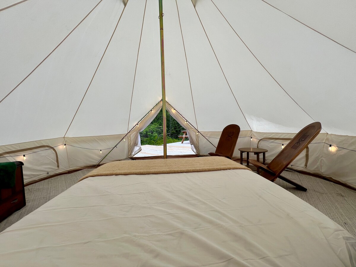 Alami lambang glamping di Belle Tents yang terpencil, tempat percutian yang tenang hanya 40 minit di luar Halifax. Pengalaman Off-Grid sebenar: — Tiada air mengalir, kuasa, atau septik — Akses kerikil sepanjang 1.5km — Perkhidmatan telefon & wifi minimum: simpan maklumat daftar masuk Ciri-ciri Khemah: — Khemah bergaya & peralatan tempat tidur mewah — Dapur luar dengan BBQ Catatan: — Dikongsi: Pancuran mandi luaran yang dipanaskan solar — Dikongsi: Portapotties yang dilantik dengan baik Terokai: — Akses tasik + papan SUP — Lubang api peribadi dengan pencahayaan solar