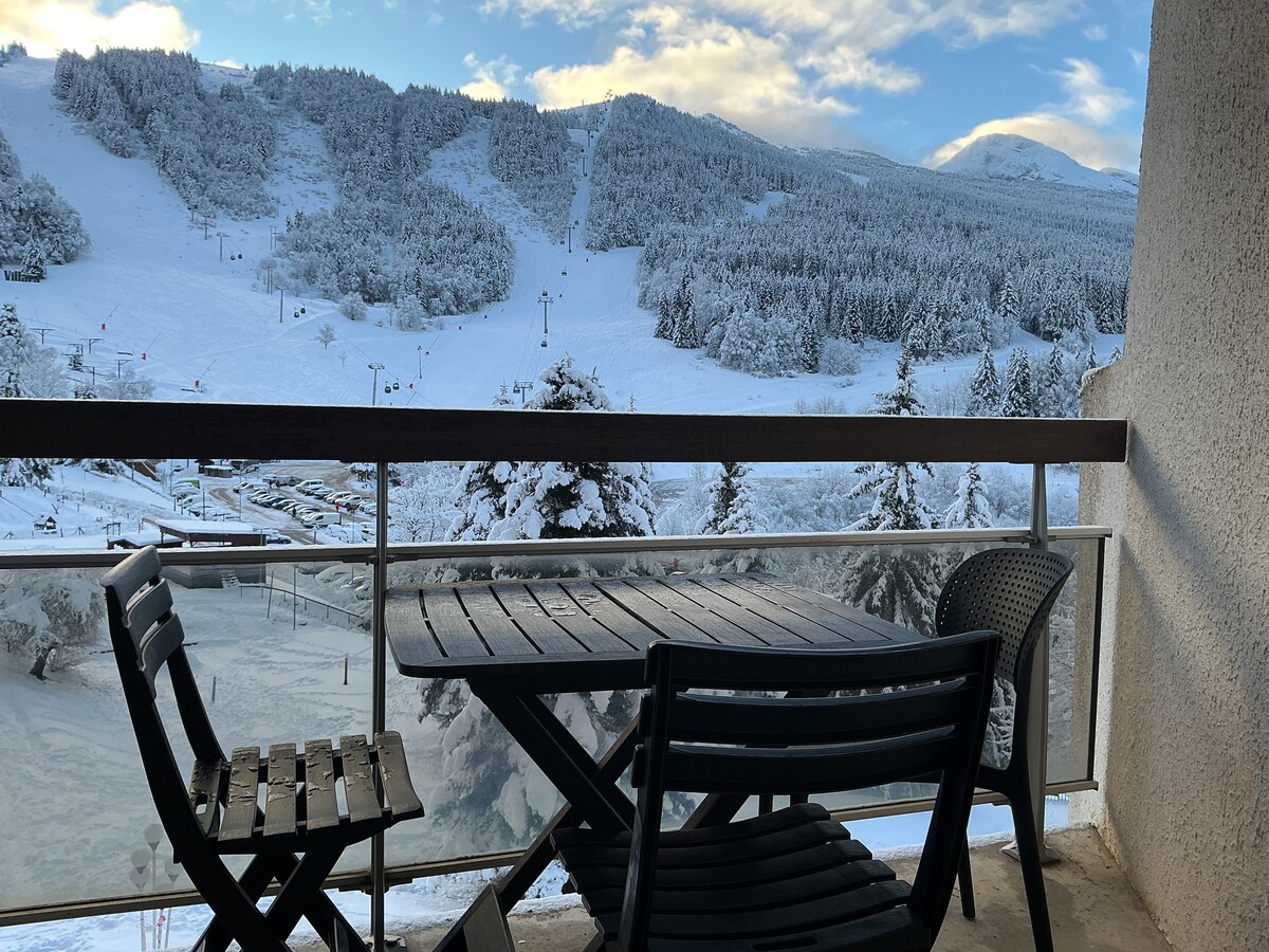 ❄️ Studio mini serba lengkap ❄️ ⛷️Berangkat ski terus: kerusi lif dan ulang-alik percuma di kaki kediaman 🏡 Kediaman yang tenang, dikelilingi oleh alam semula jadi di tengah-tengah estet Glovettes, tingkat 1, lif 🅿️ Tempat letak kereta 🛏 Katil sofa 2 orang Katil mezanin 2 orang (⚠️siling rendah) 🎿 Bilik ski/basikal 🛷 Tobogan tersedia 🔑 Daftar masuk dan daftar keluar sendiri 🛜 Wi-Fi Gentian + TV Pintar 🚫 Cadar tilam/tuala tidak disediakan ➡️ caj tambahan 🧽 Pembersihan atas tanggungan anda