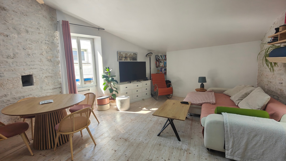 Durant l'éte, je vous propose ma résidence principale. Située à deux pas du marché de St Pierre d'Oléron, vous pourrez profiter de toutes les commodités à pieds ou à vélos. Composé d'un grand salon et d'une cuisine ouverte, vous trouverez également deux chambres, dont une sous les toits. Chacune avec son dressing. La salle de douche est petite mais sa douche spacieuse vous fera oublier ce détail. Une petite cours commune vous permettra de stocker vos vélos pour laisser la voiture sur le parking.