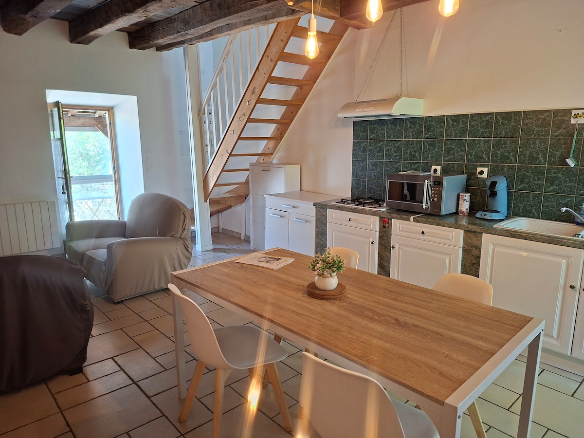 Rumah berasingan kecil yang menawan, termasuk 1 ruang tamu besar dengan katil sofa, 1 dapur lengkap dengan bar, ketuhar, mesin pencuci pinggan, penyejuk beku, ketuhar gelombang mikro, 1 bilik tidur mezzanine terbuka ke ruang tamu dengan 1 katil 160, 1 bilik air dengan shower dan tandas. TV skrin rata, pemain DVD, sistem hi-fi, permainan papan, buku, CD, DVD, mesin basuh. Tanah wifi dengan pokok. Persekitaran yang tenang dan mendamaikan... Teres yang cantik dengan barbeku, perabot taman. Katil disediakan semasa ketibaan.