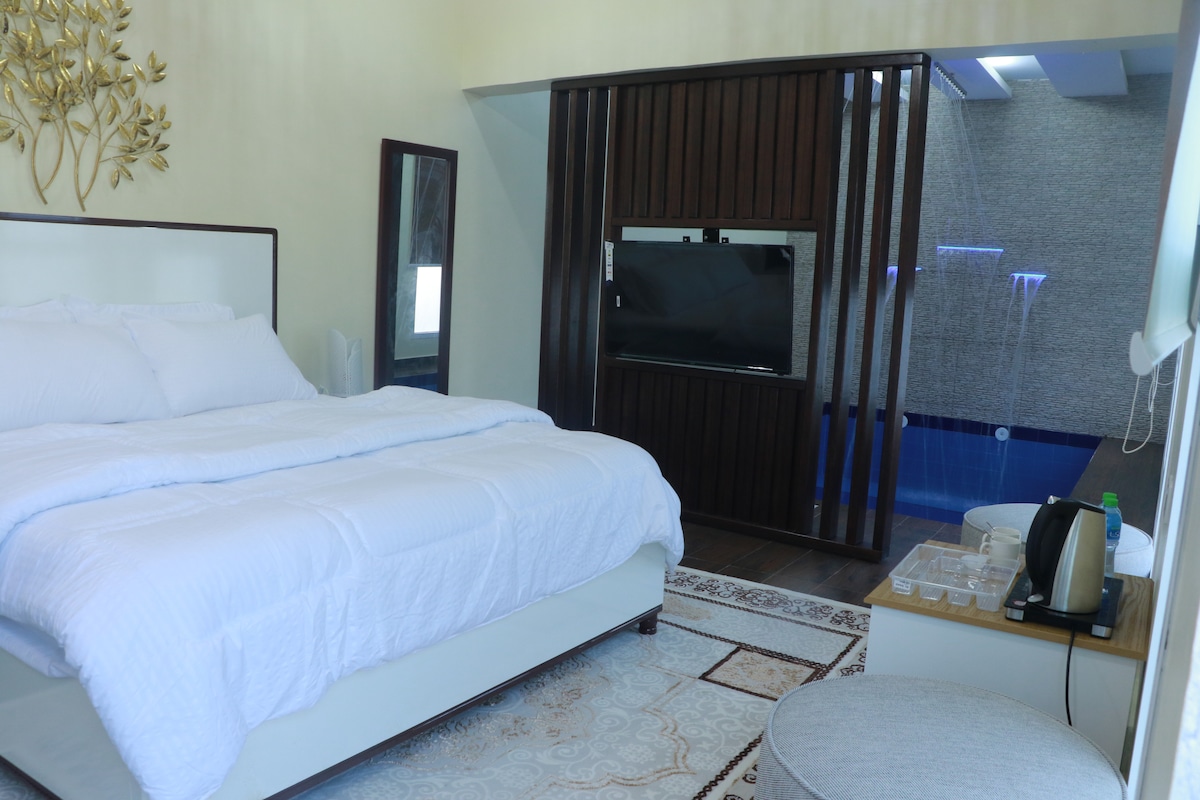 A place for two people only To make the most beautiful memories with us The chalet was built with care and with very beautiful details that make an atmosphere of calm and relaxation in the midst of nature, mountain view and with complete privacy Electric car charger is available Full private swimming pool The chalet is private and all facilities surrounded by land walls There is a hot jacuzzi bath (for winter) as well as a steam room And a very beautiful location away from noise and Annoyance