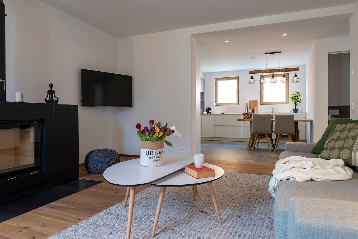 Dalam kedudukan panorama, apartmen moden di tingkat satu kediaman baharu dengan spa. Apartmen ini mempunyai teres yang indah. Ruang tamu adalah ruang terbuka yang besar dengan dapur lengkap, kawasan perbualan santai dan meja makan. GARAS: sesuai untuk kereta sederhana/kecil. Tempat letak kereta percuma tambahan tersedia berdekatan (ditunjukkan dalam arahan yang akan dihantar)