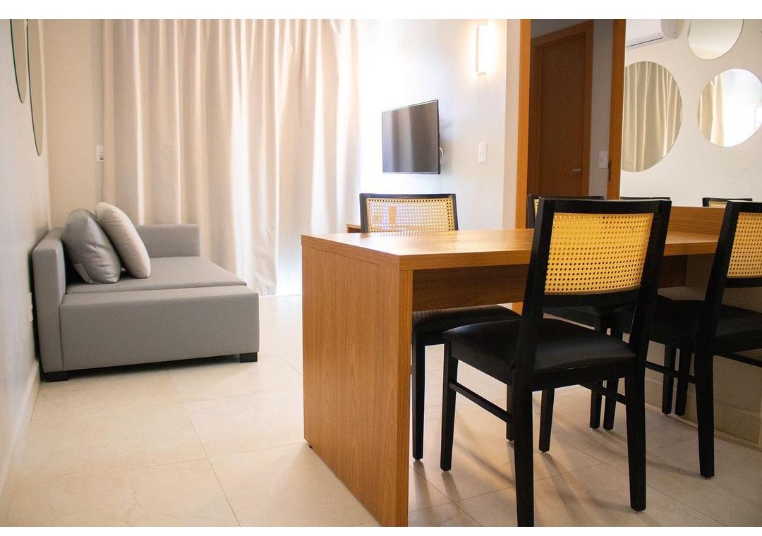 Apartamento de 37m² com sala e cozinha integrados. Sala com sofá, ar-condicionado e smart TV 43”. Cozinha com mesa, 4 cadeiras, micro-ondas, frigobar e utensílios básicos, além de varanda com mesa e cadeiras. Quarto com ar-condicionado, cama de casal e smart TV 43. Banheiro social, amenities e enxoval completo. Wi-Fi gratuito no apartamento e áreas sociais. Acomodação com cama de casal e sofá-cama na sala, sem cama extra. Por regra do resort, pode ocorrer troca de apartamento durante a estadia.