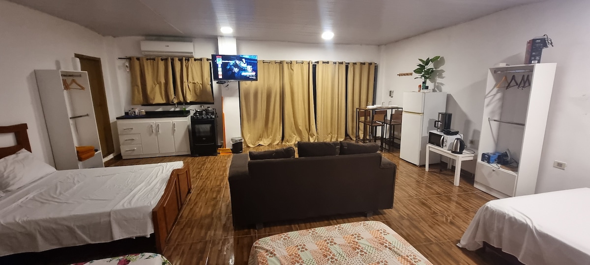 Suite selesa yang dikelilingi oleh pokok-pokok yang subur, kolam renang dan gril, terletak di kawasan Amfiteater, beberapa langkah dari pasar raya, restoran, bar dan tempat pelancongan untuk menikmati yang terbaik di Sanber! Ia mempunyai semua keselesaan untuk berehat, memasak, bekerja dan berseronok. Tempat ini lahir daripada visi menggabungkan rumah gaya ekologi dengan persekitaran yang sangat semula jadi, dengan pokok asli yang besar dan beberapa spesies burung yang kerap mengunjungi tempat ini.