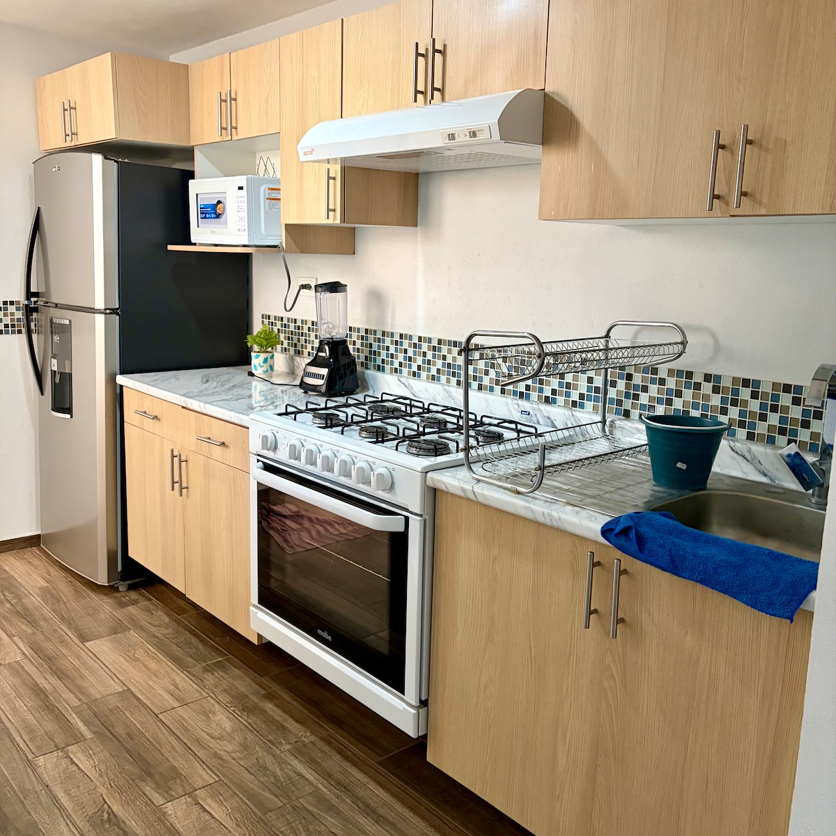 Bright, modern high-rise space on the 18th floor with open city views. Ideal for couples, friends, and relaxed longer stays. 3 Queen beds for up to 6 guests Equipped kitchen Large-capacity washer and dryer machine. Electric blinds and high-speed Wi-Fi for home office. Enjoy a 24/7 GYM, rooftop, and in-building parking for 2 cars. Pet-friendly building with security service and 24/7 security cameras. Quick access to Cholula (5 min away), Angelópolis (8 min away), and key attractions