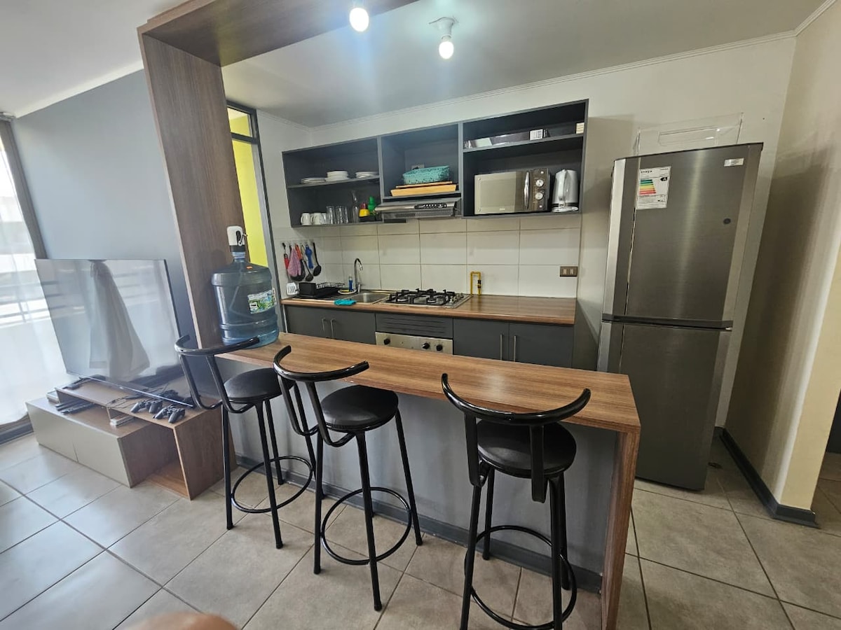Apartmen dalaman mini yang selesa disewakan dengan perabot lengkap dan lokomotif di pintu, sesuai untuk seseorang atau pasangan yang mencari keselesaan dan kepraktisan. Ia mempunyai: -27 meter persegi ruang yang diagihkan dengan bijak. - WiFi -Bilik bilik dengan katil 2 tempat duduk dan almari - Dispenser air - Ruang kerja - Bilik mandi - Dapur dengan semua kemudahan - Peti sejuk/TV -Plancha/pengering rambut/linen Terletak berhampiran: - Miramar School - U. de Tarapacá - Pengangkutan awam di pintu