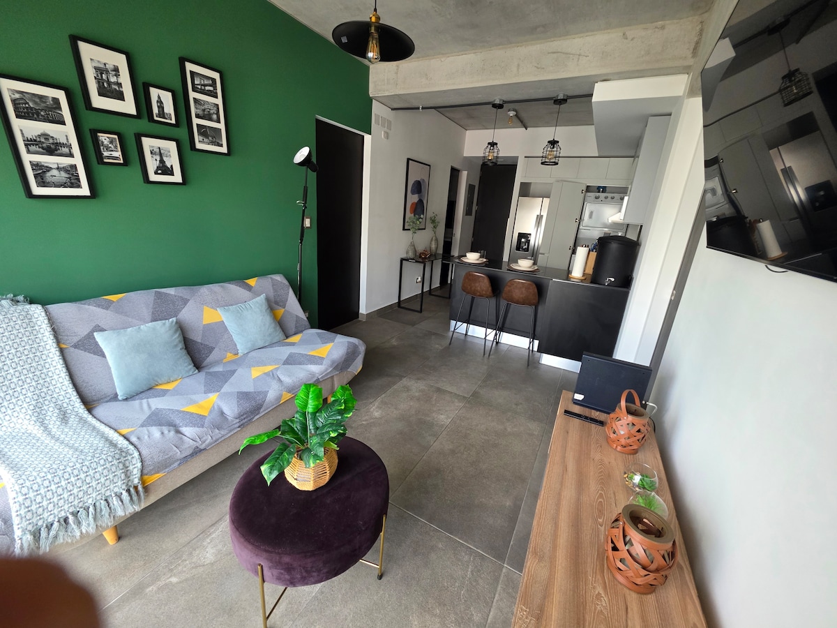 Apartmen moden di Shift, Cayalá, lengkap, memuatkan sehingga 5 tetamu. Jarak berjalan kaki ke Pusat Cayalá, restoran, kedai dan universiti; hanya 5 minit dari Kedutaan A.S. Ruang 2 bilik tidur, dapur lengkap, ruang tamu dengan sofa boleh tukar, 2 bilik mandi, 2 almari, balkoni dengan pemandangan, tempat letak kereta untuk 2 buah kereta Keselesaan WiFi, TV dengan Netflix, kipas, mesin basuh, pengering, seterika dan banyak lagi Kemudahan Kolam renang panas, gimnasium, kawasan yoga, spa, bilik bawah tanah wain, ruang kerja bersama dan teres Akses Akses mudah