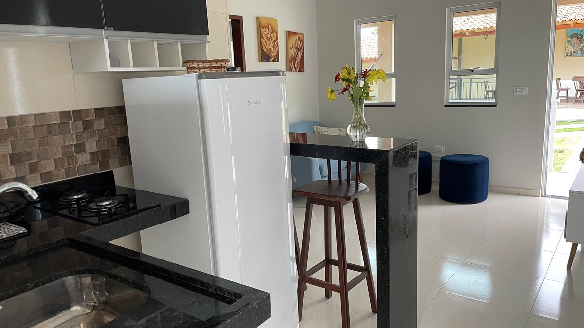 Ini ialah penginapan yang ideal untuk anda berehat atau berseronok bersama keluarga anda. Chalet dengan dua bilik tidur, dilengkapi dengan penginapan untuk sehingga lima orang, salah satu bilik ialah suite, bilik mandi awam, kawasan rekreasi di hadapan chalet dengan barbeku, dapur gas dan peti sejuk, pancuran mandi di luar, meja untuk permainan, buaian rajut untuk berbaring dan berehat, peralatan bunyi untuk karaoke atau muzik live, tempat letak kereta selamat termasuk dalam kadar harian.
