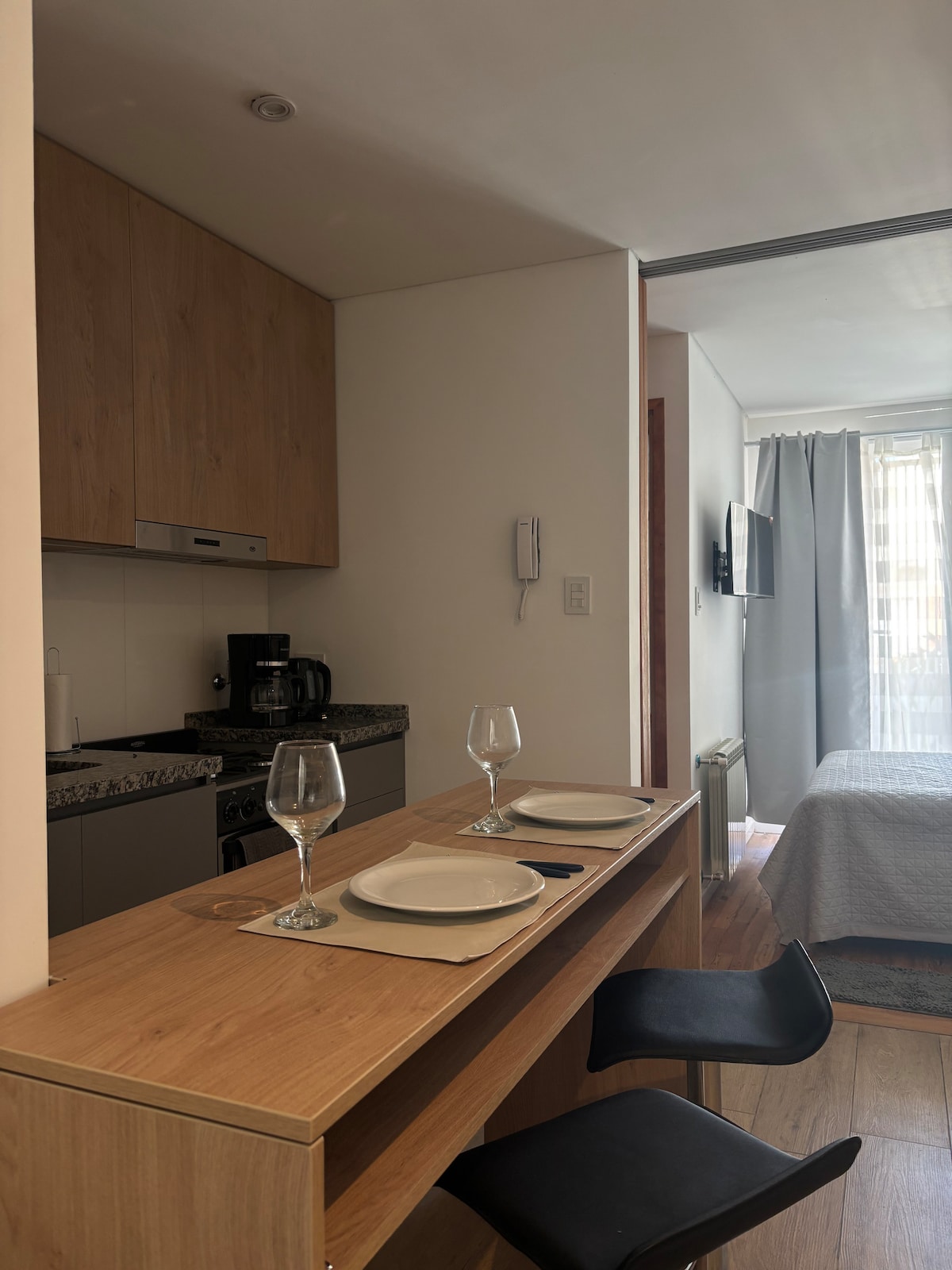 Alojamiento tranquilo y luminoso con diseño moderno, a pasos de Boulevard, Universidad, shopping, bares y peatonal. Cocina equipada, sommier queen size, placard, aire frío/calor, ropa blanca, living comedor TV, sofá, Wi-Fi de alta velocidad. Baño completo con ducha de optima presión. Balcón con vista verde al corazón de manzana. Edificio con moderno ascensor, SUM y loundry con lavarropas automático y tender.