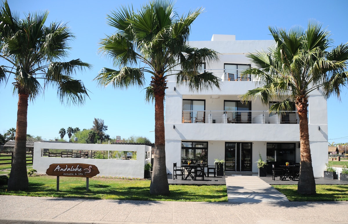 Andaluhe Posada es una propuesta en Miramar de Ansenuza, a metros de la laguna y dentro del entorno del Parque Nacional Ansenuza. Cuenta con atención personalizada, ofrece una experiencia íntima. Su habitación Superior Matrimonial brinda amplitud y confort premium. Piscina, jardín y desayuno completan la estadía. Naturaleza, aves y atardeceres únicos hacen de cada visita una pausa inolvidable.