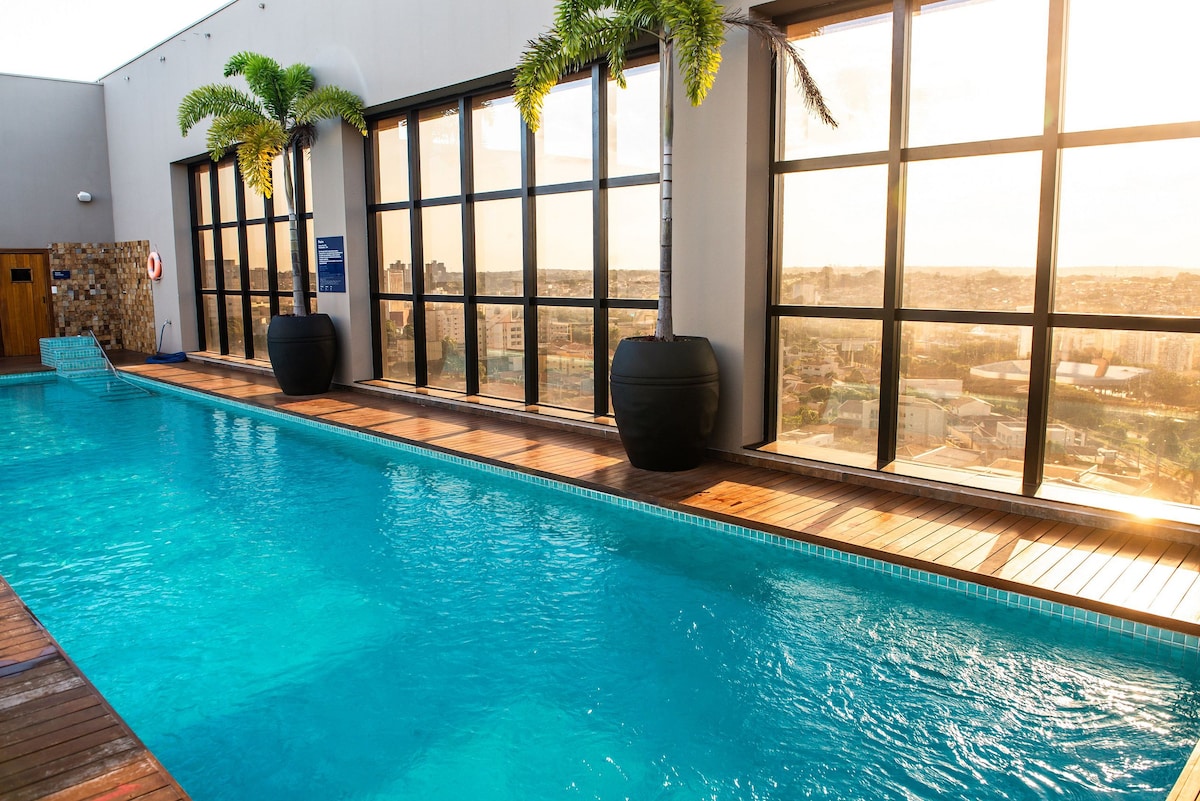 Flat in the Square Faria Lima complex (Comfort Suites) with city views and kitchenette. Dedicated workspace. The building offers a rooftop pool, hot tub, gym, game room and restaurant. 24h front desk. 📍 600m from Hospital de Base, 400m from Beneficência Portuguesa Hospital, 800m from Plaza Avenida Shopping and 1.3km from Riopreto Shopping. Perfect for medical visits, business trips or leisure. Apt 407, 4th floor.