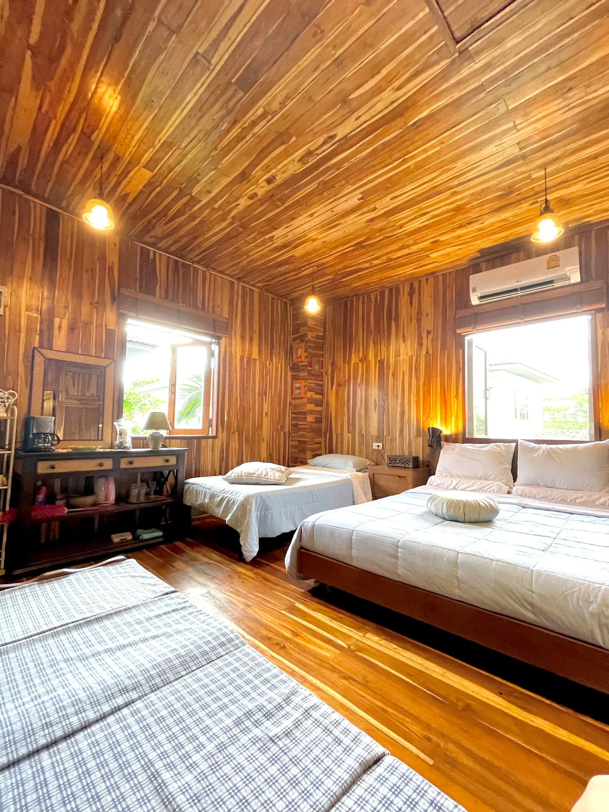 (URL tersembunyi) Vila kami berada di kawasan kediaman mewah, cahaya tasik dan gunung, dengan kelab riadah mewah dan kos rendah.Terletak di bandar, 2 blok dari bandar purba, tempat tinggal yang selesa, terdapat pelbagai gaya restoran dan kafe di jalan di luar pintu, terdapat kedai serbaneka 24 jam, BigC, Makro dua pasar raya.Mudah untuk bergerak, anda boleh menghubungi kereta berganda atau teksi, anda boleh menyewa kereta ke perkhidmatan pintu, anda juga boleh pergi ke kereta sewa. Vila ini berukuran 540 meter persegi, bangunan kayu tunggal berada di sudut halaman vila, hanya ada satu bilik tidur di tingkat atas, terdapat bilik mandi peribadi, terdapat kerusi kayu di balkoni laluan pejalan kaki luar, bilik terbuka besar di tingkat bawah, meja kayu besar dan bangku kayu panjang, dapur luar, ketuhar.Selesa, romantik dan benar-benar persendirian, adalah rumah percutian rakan dan keluarga yang baik.Seluruh villa berperabot lengkap dan lengkap. Anda boleh melihat matahari terbit dan terbenam dari kejiranan ini, dan pemandangannya tidak berkesudahan.Anda juga boleh belayar di bot dan berjalan-jalan di sekitar tasik.Terdapat stadium standard antarabangsa, kolam renang, sauna, gelanggang tenis, gelanggang bola keranjang, gelanggang badminton, gimnasium (sistem keahlian berbayar) dengan restoran gourmet.Vila rumah kayu ini boleh memuatkan 1 hingga 4 orang (termasuk katil queen dan dua katil satu meter, dengan selesa).10 minit dari lapangan terbang antarabangsa, 15 minit ke bandar purba, Expo Park, Chiang Mai University 15 minit dengan kereta (URL tersembunyi) Ini adalah awan air sebenar, ini adalah Chiang Mai terbaik!