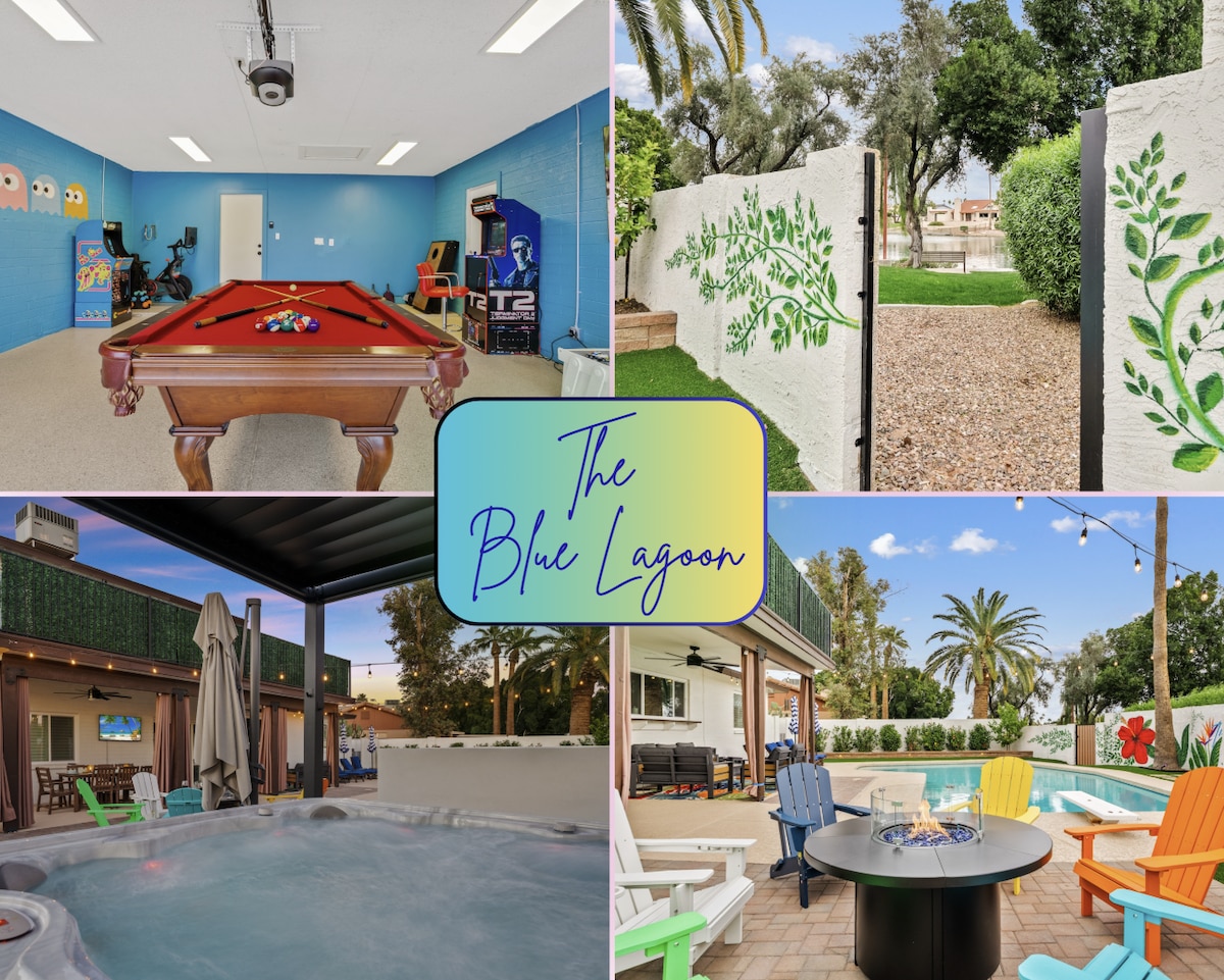 Oasis depan tasik dengan pemandangan poskad. Kolam renang tepi infiniti yang panas atau sejuk sepanjang tahun tanpa kos tambahan, serta spa terapi cahaya 8 tempat duduk tersembunyi. Dermaga dengan kayak, lubang api, patio tertutup dan pemanggang untuk makan malam sambil melihat matahari terbenam. Vila satu tingkat menempatkan sembilan orang: empat bilik tidur, 3.5 bilik mandi, dapur gourmet terbuka dan bilik yang hebat untuk malam permainan. Pejabat khusus dengan katil Murphy, atau bekerja di mana sahaja dengan pemandangan panorama. Beberapa minit ke lapangan terbang, tempat makan, golf, denai, latihan musim bunga & scottsdale. Tempah penginapan anda yang penuh kenangan sekarang.