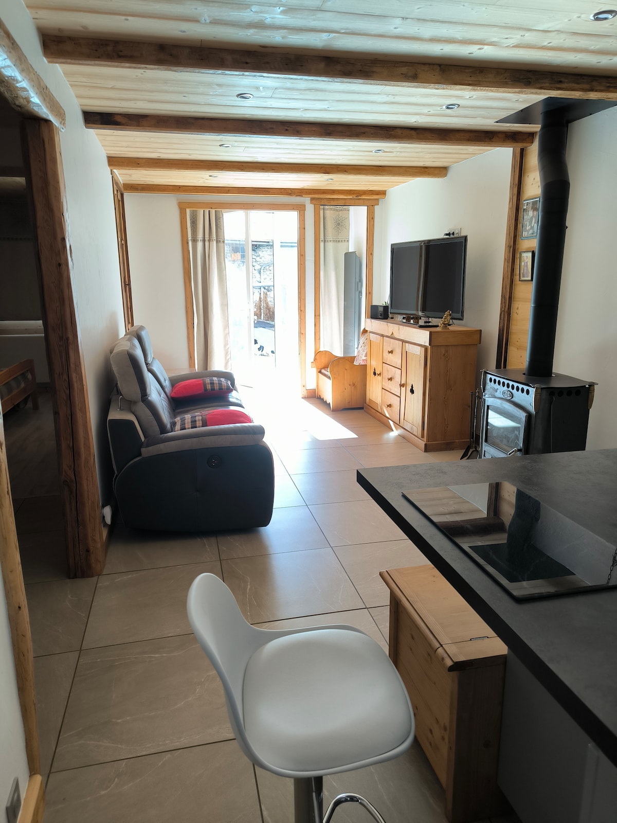 A modern and spacious one bedroom apartment with sofa bed to rent for 2 to 4 people in Villard Dessus in Séez. The apartment is close to the bus stop for access to La Rosiere via the chairlift Ecudets or you can take the bus to Bourg Saint Maurice for the funiculaire to Les Arcs. Well placed for a 'ski safari', ski touring or mountain walks. The apartment is below our main house and has its own entrance. It has one parking space and access to a garden shared with us.